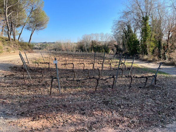 Hablemos de la bodega, estás tierras pertenecen a la trigésima sexta generación; al principio se dedicaban a la alfarería, motivo por el cual agregaron al logo de la bodega unos jarrones de barro. Tierras que con algún título nobiliario adquirido, les pertenecen desde el año 964. Ubicada en la D.O. Pla de Bages, a unos minutos bajando del monasterio de Montserrat. Una finca de 600 ha y 60 dedicadas al viñedo. Como es de esperar, en esta época del año los viñedos lucen como varas colgadas de las espalderas con sus troncos secos. Una temporada de sequía ha acabado con algunas de las vides plantadas, a tal grado de que han tenido que arrancarlas, suena alarmante sumado a la baja en el consumo de vino en la Unión Europea. Por lo menos es lo que se comenta en los medios. Después de comer caminamos por los viñedos. Nos detuvimos para observar un pago que por el costado izquierdo colinda con una arboleda y por el otro el río. Así que tuvieron que plantar las vides más separadas y con una buena exposición al viento para conservar las vides libres de hongos como el de podredumbre gris. Decía Luis muy convencido; no se trata de plantar las vides de cualquier manera, todo tiene una intención. La tierra es red clay para los norteamericanos del grupo, tierra rojiza podría ser, con una excelente regulación de agua. El último verano llegaron a los 45°C . Recuerdo haber visto plantas de romero alrededor del viñedo. En el pasado, a principios del XX, hubo muchos que abandonaron la vitivinicultura por la filoxera, ese pulgón que se come la raíz de la vid. En promedio cosechan 2 kg por planta, no sé si con desniete, que es lo más probable. A la orilla del viñedo vi un conjunto de cabañitas modernas, se trata de un concepto que han dado por llamar boutique. Muy cara la noche, según dijo Luis, además de que no se ven muy acogedoras por afuera, habrá que probar algún día.