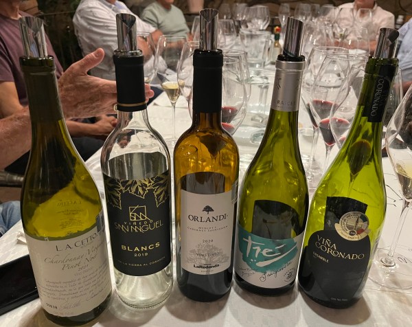 Por último: Retorno 2019, con un dibujo en la etiqueta de una indicación de retorno. Misma bodega del Valle de Guadalupe. Todos percibimos notas salinas en los 3 tintos de la noche, la escasez de lluvia, como este año en el sur, provoca que la salinidad se concentre en los suelos además de los pozos de agua con los que se riega el viñedo en algunos casos. Este vino fue el mejor de los tintos. Huele a tamarino, fruta negra y notas de lavanda. En boca es redondo, buena acidez y tanino, final medio, en general bebible sin enamorar a nadie. Para probar otra botella.
