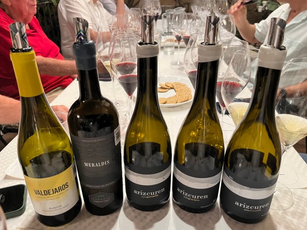 Abrimos boca con un verdejo de Rueda, Valdejaros 2024. Al igual que muchos espumosos cacarean que están reposados en sus lías. Uno de esos blanquitos que conectan al paladar y quedan impresos en la memoria. Color amarillo pálido, brillante y fluido. Muy aromático, después de descorcharlo seduce la nariz con aromas a toronja blanca, espino y una nota de piña verde. En boca tiene una acidez comedida y un final de agua quina. Para media caja. Sin duda el mejor de la noche.